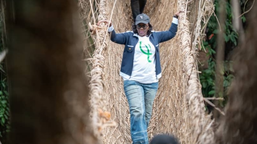 À Poubara, la ministre a pris part à l’inauguration du 197ᵉ pont en lianes, une cérémonie ancrée dans les traditions locales. Bien plus qu’un simple ouvrage, ce pont incarne un savoir-faire transmis de génération en génération et un lien tangible entre les communautés et leur environnement.
